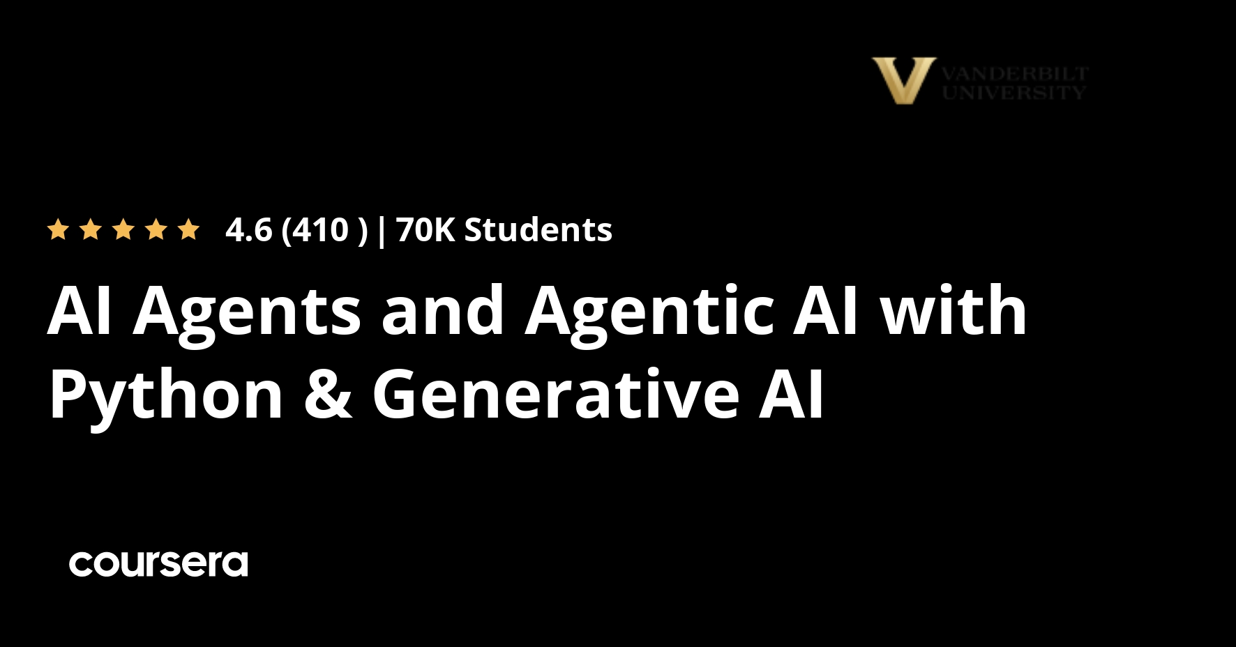 従来のAIツールとは一線を画す「AIエージェント」の開発が学べるコースです。Vanderbilt Universityが提供するこちらのプログラムでは、指示を待つだけでなく自ら思考し、行動し、問題を解決するAIエージェントの構築方法をPythonで習得できます。